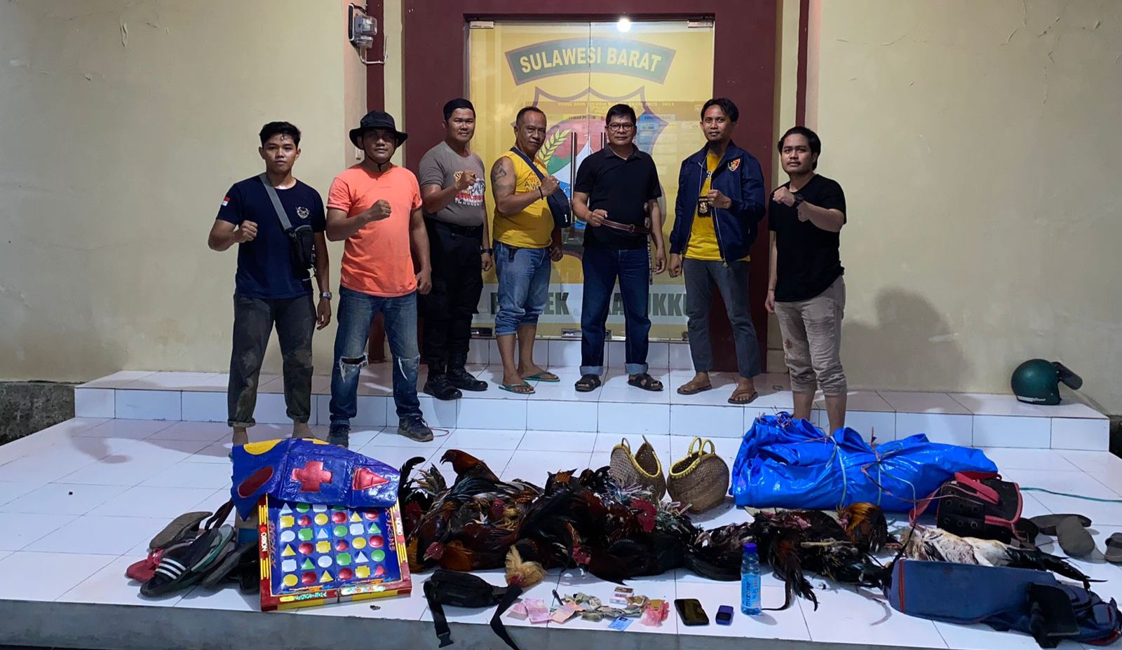 “Adapun barang bukti yang diamankan di lokasi kejadian yaitu ayam mati 7 ekor, ayam hidup 17 ekor, terpal warna biru 1 lembar, keranjang ayam 4 buah, meja bola setan 1 buah, sandal beberapa pasang, sweter 1 Lembar, HP android Oppo 1 buah, HP Nokia 1 buah, tas besar 2 buah dan domino 2 bungkus,” ungkapnya.