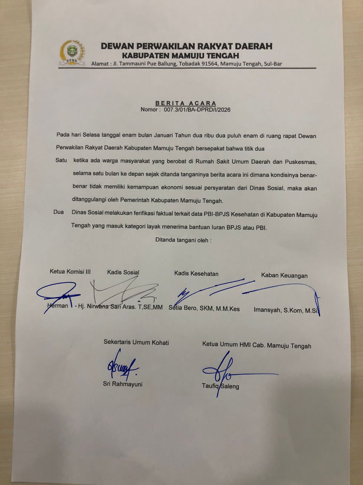 Hal ini sesuai dengan yang tertuang dalam berita acara yang di ditandatangani oleh unsur DPRD dan pemerintah daerah, yakni Ketua Komisi III DPRD Mateng, Kepala Dinas Sosial, Kepala Dinas Kesehatan, Kepala Badan Keuangan Daerah, serta perwakilan organisasi mahasiswa yang turut mengawal isu tersebut, yakni Korps HMI-Wati (KOHATI) dan HMI Cabang Mamuju Tengah.