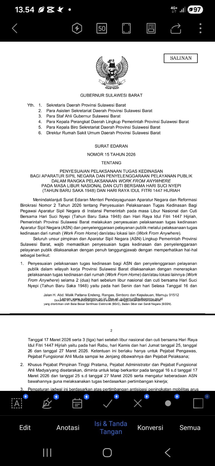 Kebijakan tersebut tertuang dalam Surat Edaran Gubernur Sulawesi Barat, Suhardi Duka Nomor 15 Tahun 2026 tentang Penyesuaian Pelaksanaan Tugas Kedinasan bagi ASN dan Penyelenggaraan Pelayanan Publik.