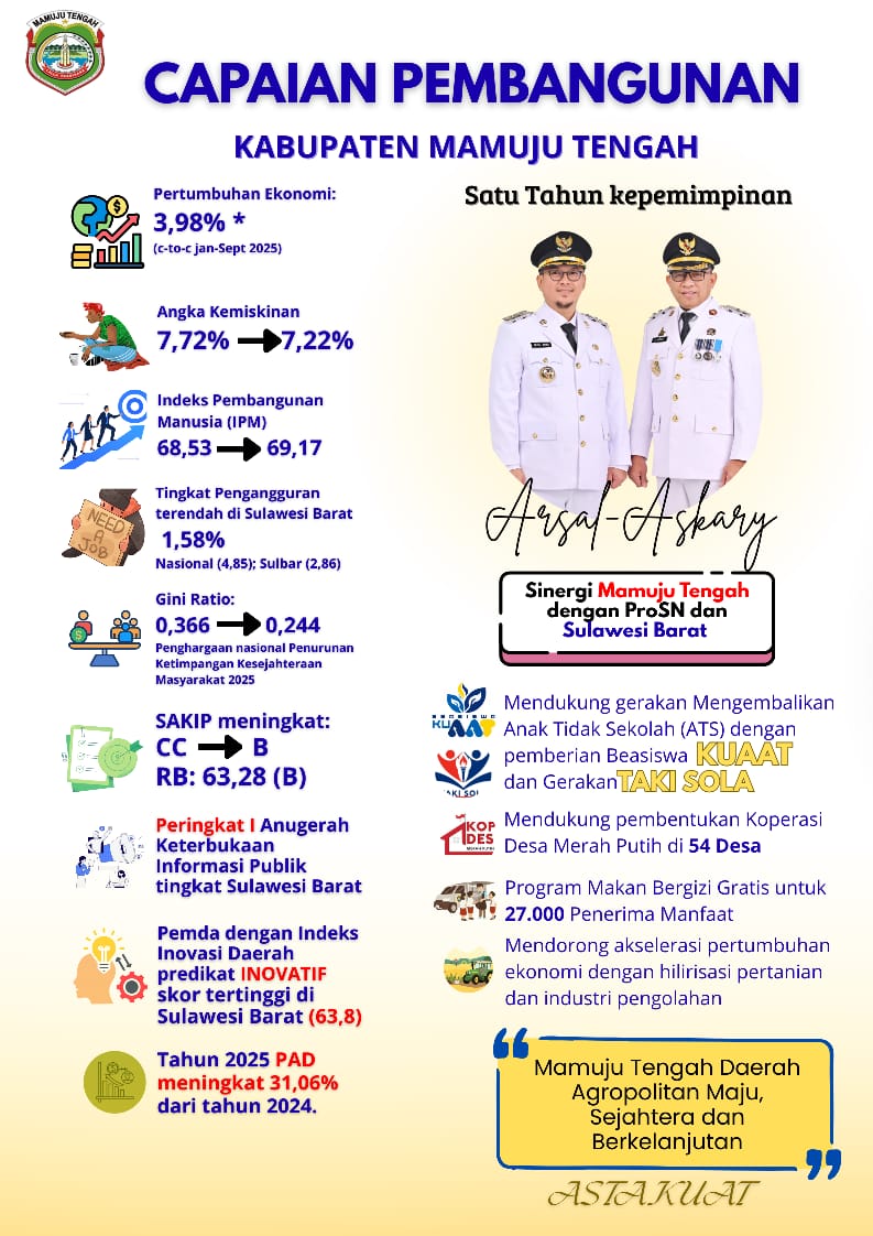 Dalam satu tahun kepemimpinan, sejumlah indikator makro daerah mengalami perbaikan. Pertumbuhan ekonomi Mamuju Tengah tercatat sebesar 3,98% (Januari–September 2025). Angka kemiskinan berhasil ditekan dari 7,72% menjadi 7,22 persen%, sementara Indeks Pembangunan Manusia (IPM) meningkat dari 68,53 menjadi 69,17.